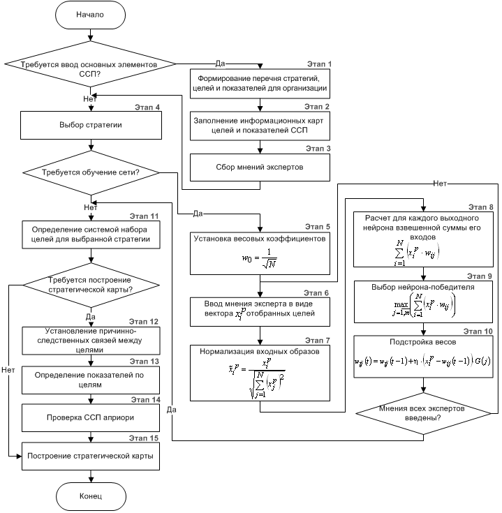 Таким образом, разработан метод инженерии ССП на основе искусственных нейронных сетей Кохонена, позволяющий получить структуру стратегических целей и связанных с ними показателей ССП. Представлен детальный алгоритм для этого метода. На базе представленного алгоритма разработана интеллектуальная информационная система формирования целей и показателей ССП [3].