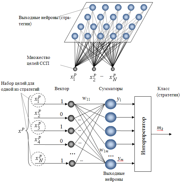 По мере ввода данных осуществляется обучение сети (корректировка весовых коэффициентов). Результат работы сети - код класса, к которому принадлежит предъявленный на входе объект, в данном случае стратегия, которой соответствует определенный набор целей. В нейросетях принято кодирование номером канала. Поэтому сеть будет иметь m выходов, по числу классов (стратегий), и чем большее значение принимает выход номер mk , тем больше "уверенность" сети в том, что входной объект принадлежит к классу mk. Каждый выход можно трактовать как вероятность того, что объект принадлежит данному классу.