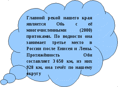 Речная сеть территории Ханты-Мансийского автономного округа - Югры принадлежит бассейну Карского моря. Главными водными артериями являются реки Обь и Иртыш. Протяженность Оби в пределах нашего округа составляет 928 км, Иртыша – 222 км. Устье Иртыша разделяет Обскую систему на две части – Среднюю и Нижнюю Обь. Реки на Севере имеют особое предназначение. Они не разделяют, а связывают людей, так как часто являются основной дорогой между населенными пунктами. Ещё на территории округа насчитывается около 300 тысяч больших и малых озёр.