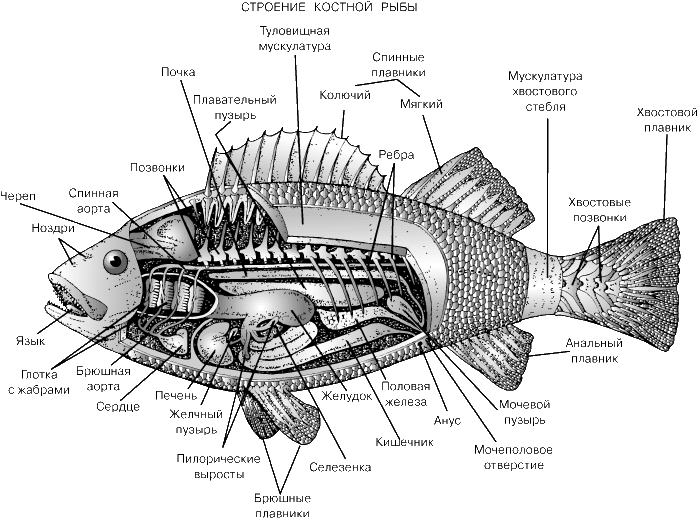 К внутренним органам рыб относят: пищеварительную кровеносную систему, печень, сердце, плавательный пузырь, почки и половые органы - гонады